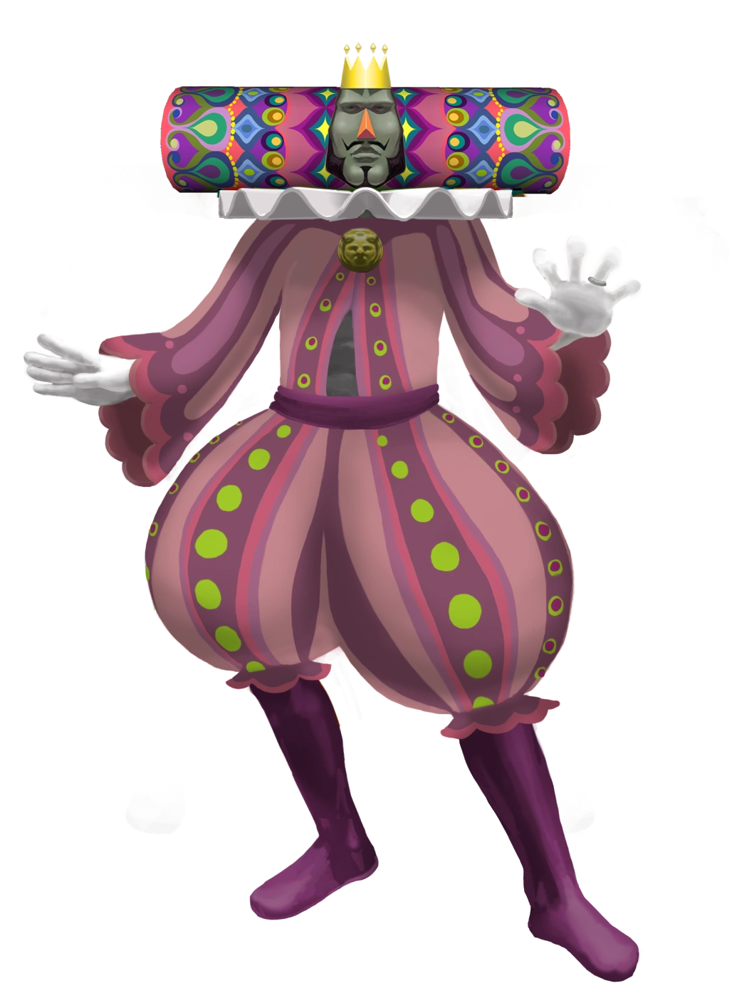He sports a frumpy outfit, a shirt that reveals his stomach, and a dark red cape. This is his first outfit that does not include tights, giving the King a slightly more modest design.