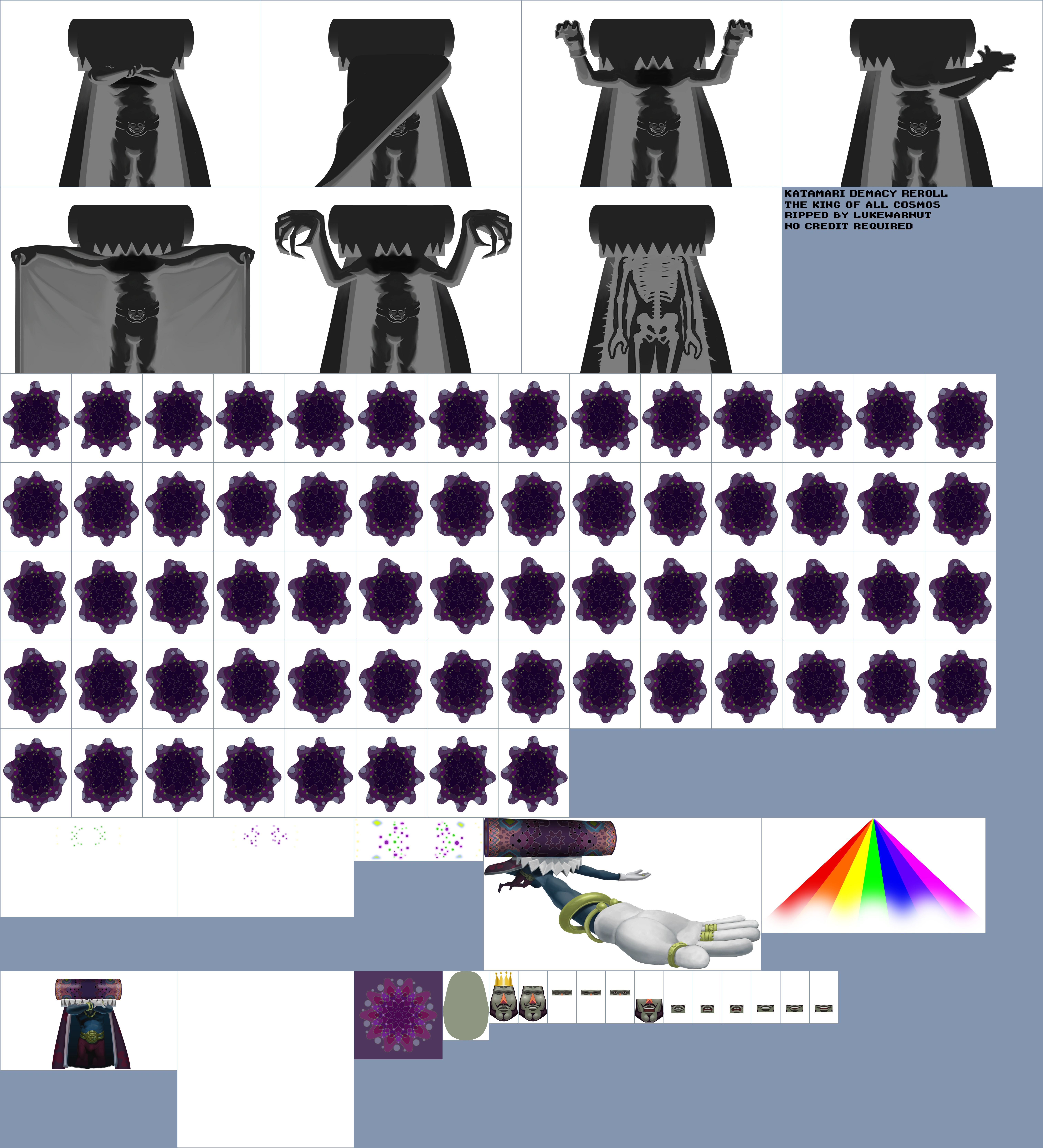 He wears an all white suit and cape with gold bracelets and trims that sport small glowing purple lights (similar to the design of his headdress in Katamari Damacy), a purple shirt, and a gold lioness medallion.