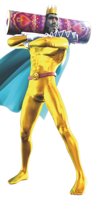 The King wears a red cape and a full-body gold outfit, similar to his Touch My Katamari outfit. He wears two gold necklaces and a thong outline is seen under his suit.