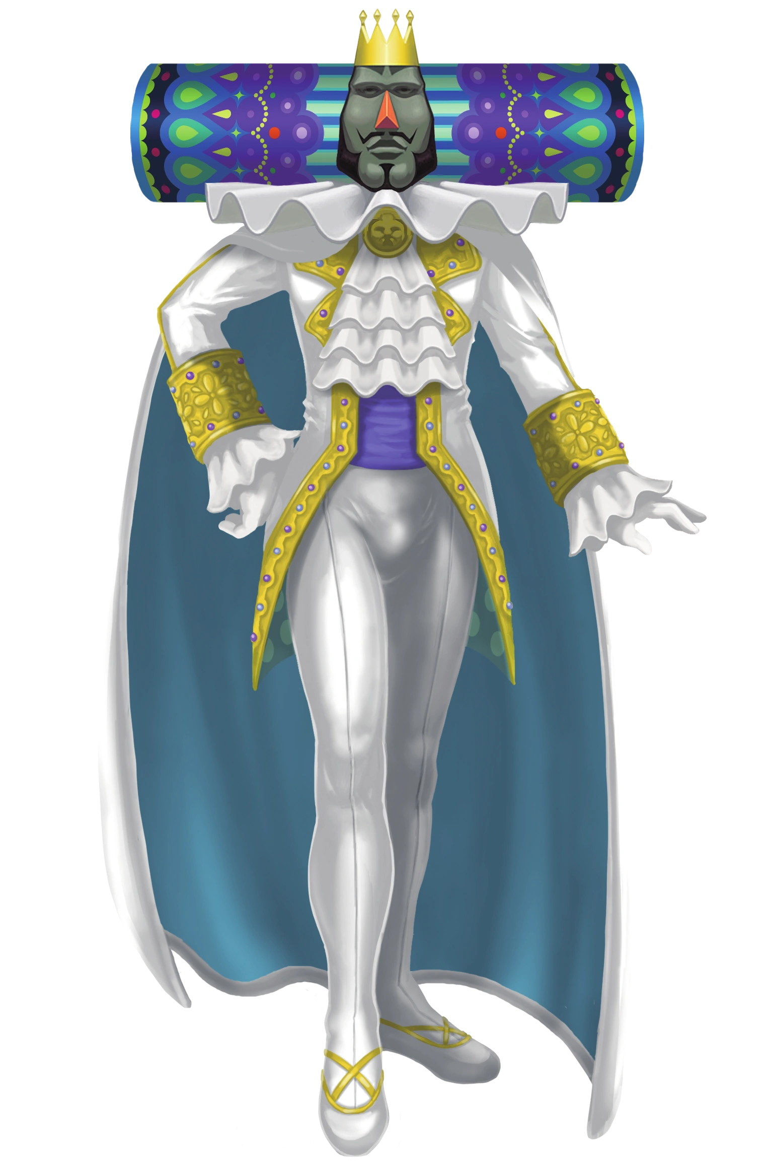 The King has gone through a multitude of different designs and clothing throughout the series, but his nose, crown, headdress and goatee are always left untouched, and usually wears lots of golden chains, capes and belts.