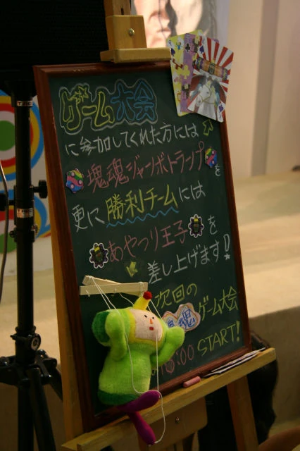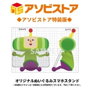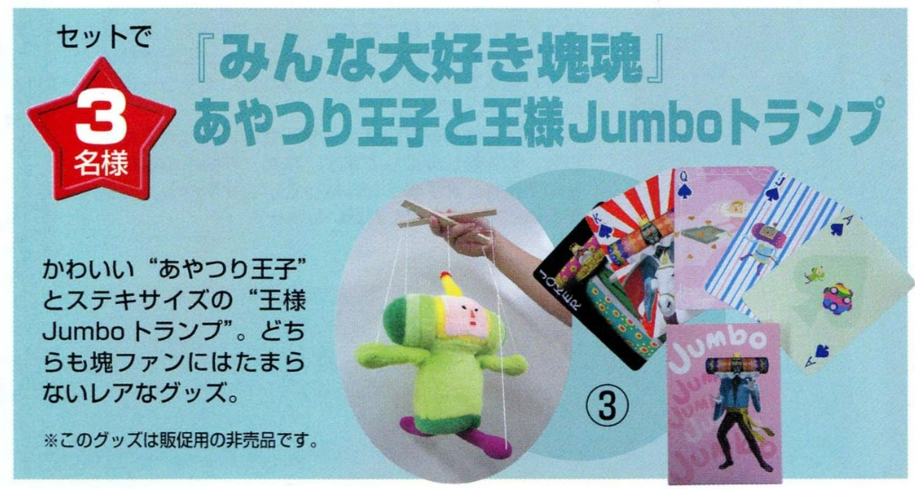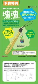 | For a limited time, if you preordered Katamari Damacy, you would receive a Katamari-themed fabric phone strap.[2] This strap is yellow with "塊魂" in green text plastered on it and has a Prince charm with him sitting on top of a Katamari. | Prince phone strap Promotional standee |
