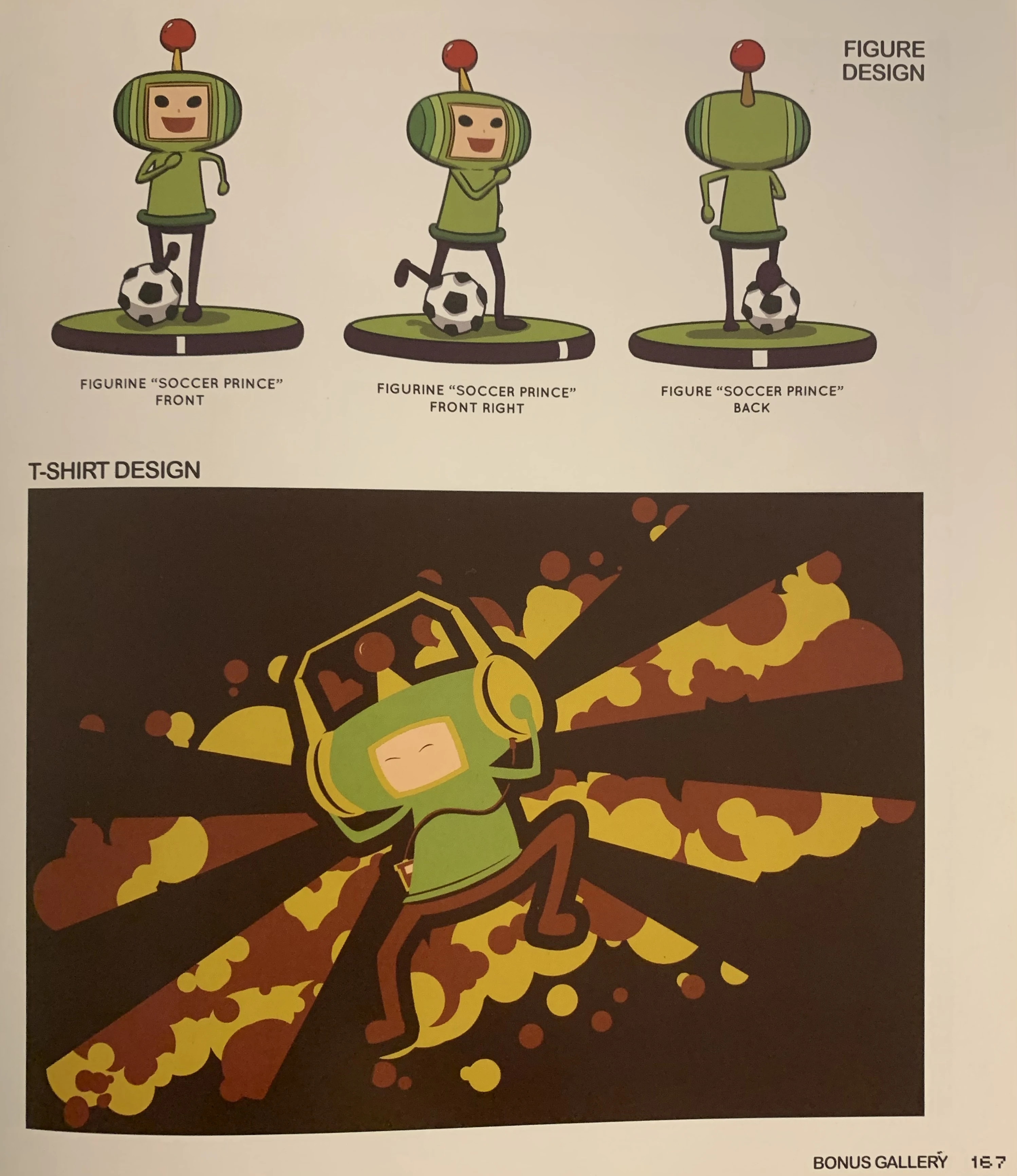 | There is a concept sketch of a figurine featuring The Prince playing soccer and a T-shirt design of The Prince wearing headphones in the Katamari Webcomic book. | |