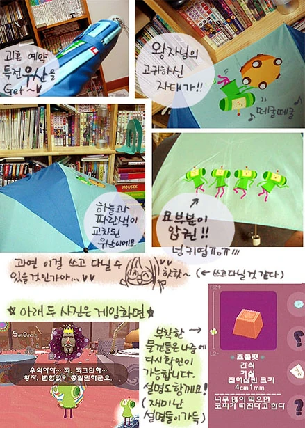 | An umbrella was designed and distributed Sony Computer Entertainment Korea for the Korean release of Katamari Damacy.[3] Unfortunately, those who had preordered the game didn't receive the umbrella in time (or at all). An official stated: "It is the distributor's responsibility to fail to protect the rights of pre-order buyers and to have problems such as supplying supplies to offline stores before the official release date." A sincere apology to the pre-order buyers who have seen the show should be preceded, and proper measures will be needed to prevent this from happening in the future.” [4] The umbrellas ended up becoming incredibly rare, being labeled as "ultra miracle super rare umbrellas" by the King in an announcement. So far, only one image from a blog post of the actual umbrella has been found. | The only known image of the umbrella, posted by Zeros on Egloos (defunct) The umbrella's design The King mentions "There are only a few ultra miracle super rare umbrellas in the universe that shine even more because of the small quantity~" |