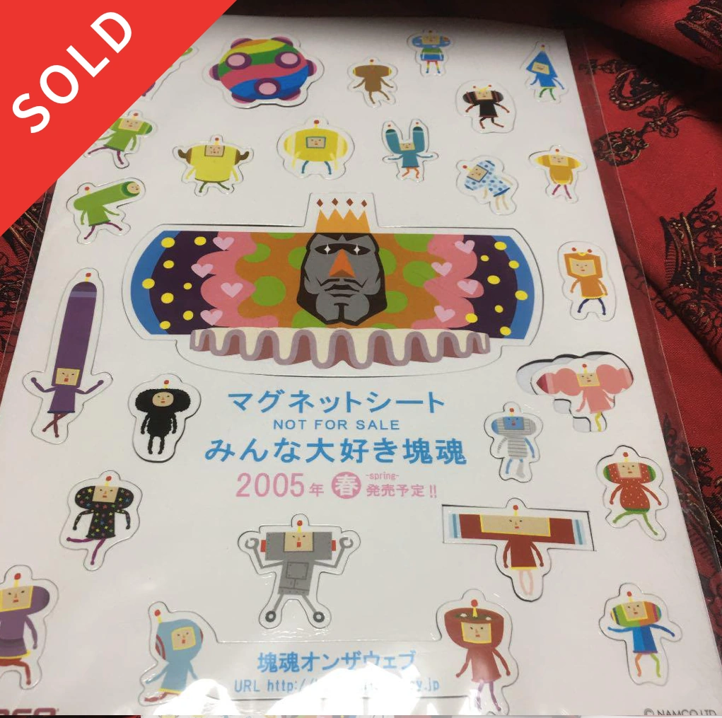 | At the Next Generation World Hobby Fair, they had Katamari versus games with the winner receiving a Prince hand puppet, and the loser receiving a magnet sheet, featuring the cousins and The King. | A close-up image of the magnets. The Prince puppet and the magnet sheet. |
