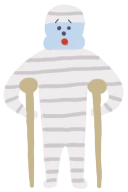 Opeo's body-hole has been patched or bandaged over and his arms, legs, and head are now only partially-bandaged. He now sports a cast on his left leg.
